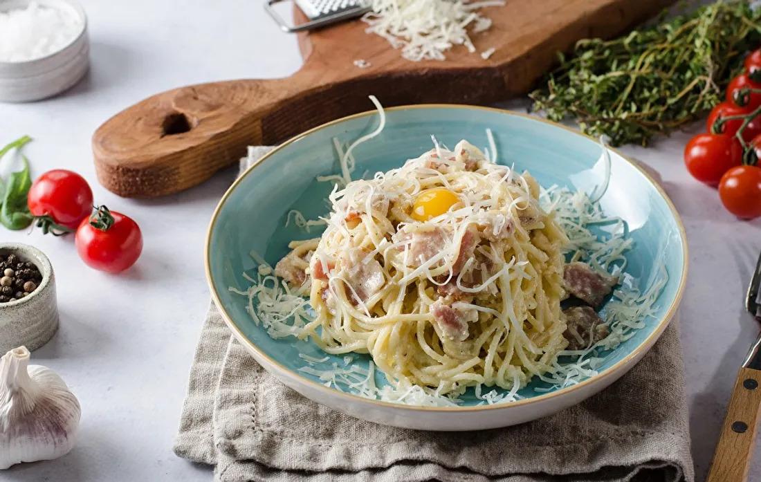 спагетти в классическом соусе карбонара со сливками, твёрдым сыром и яйцами