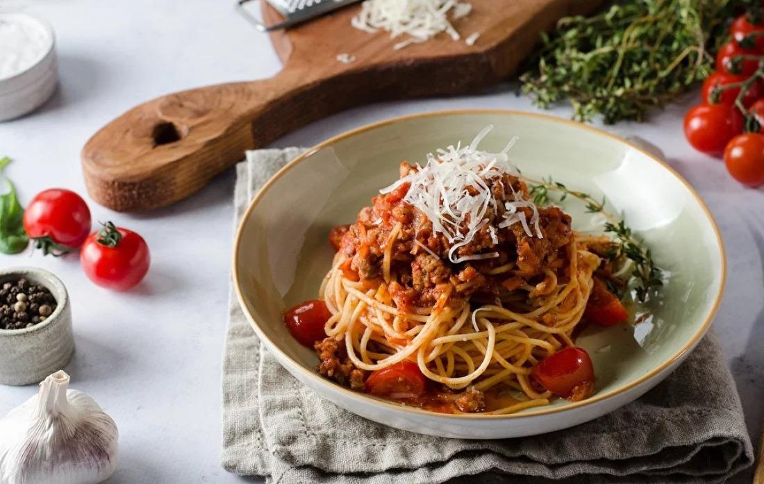 спагетти в соусе из южных томатов, рубленого мяса и розмарина с добавлением пармезана