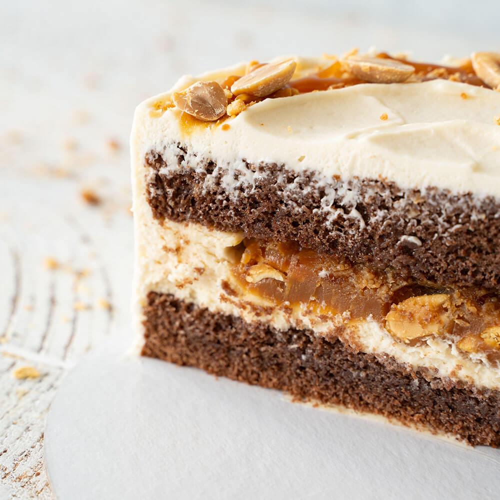 Торт для тех, кто любит плотные, насыщенные десерты. Шоколадный бисквит, тягучая карамель, жареный арахис в карамельной глазури и легкий сливочный крем. Это “Сникерс”, но еще вкуснее